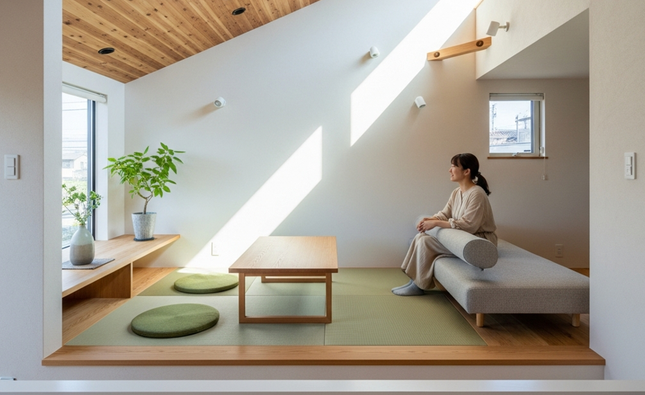 完全に壁で仕切るのではなく、段差や格子などで緩やかに空間を区切ることで、家族の気配を感じながらも、それぞれの時間を過ごせる「付かず離れず」の心地よい距離感が生まれます。
