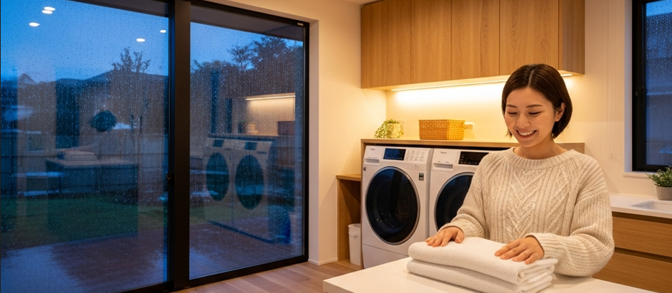 洗濯物を抱えて家中を移動する手間から解放され、天候を気にせずいつでも洗濯できる暮らしは、まさに理想的です。