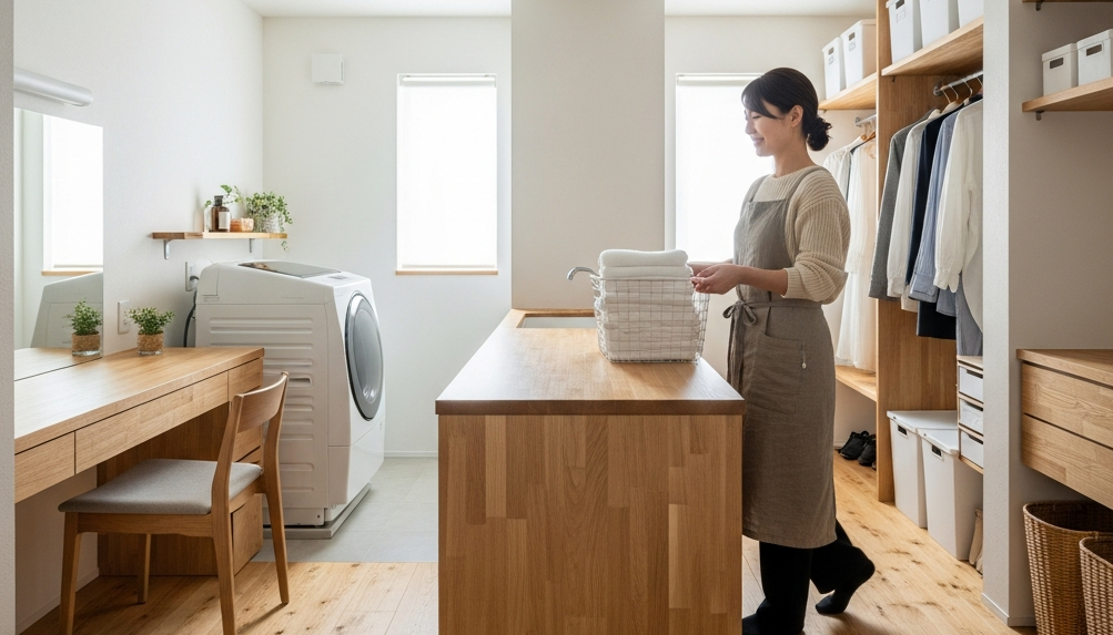衣類に関するすべての作業がこの一角で完結するため、家事の負担が劇的に軽減されます。